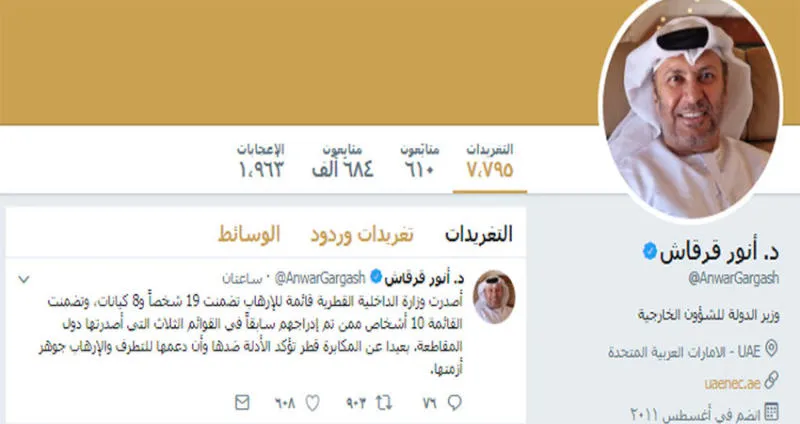 وقال وزير الدولة للشؤون الخارجية الإماراتي أنور قرقاش، إن القائمة القطرية، تؤكد مساندة الدوحة للإرهاب. وأشار في تغريدة عبر «تويتر» أمس، إلى أن القائمة القطرية تضمنت 10 أشخاص ممن تم إدراجهم سابقاً في القوائم الثلاث التي أصدرتها الدول الأربع الداعية إلى مكافحة الإرهاب. ومضى يقول: «بعيدا عن المكابرة قطر تؤكد الأدلة ضدها وإن دعمها للتطرف والإرهاب جوهر أزمتها».