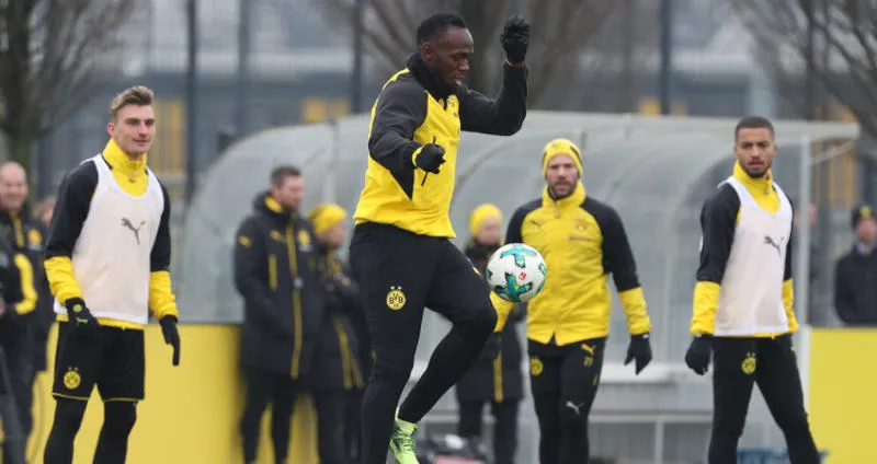 وبحضور نحو 1500 مشجع أحرز بولت (31 عاما) الذي اعتزل ألعاب القوى في العام الماضي هدفا جميلا بضربة رأس بعد دخوله أرض الملعب وسط هتاف وتشجيع الحضور إلى جانب لاعبين كبار مثل ماريو غوتزه ويوليان فايغل ليرفع له مدرب بوروسيا دورتموند النمساوي بيتر شتويغر إبهامه تعبيرا على الإعجاب والتشجيع. كما مرر بولت الكرة بين ساقي أحد المنافسين ليثير إعجاب الجمهور أيضا. وتعالت صيحات الجمهور خلال قيام العداء الجامايكي المعتزل بالإحماء قبل التدريب رغم تدني درجات الحرارة في ساعات الصباح. ويبدو من الصعب معرفة المؤهلات الكروية للبطل الأولمبي والعالمي عدة مرات، على ملعب صغير. ومثلما قال شتويغر بطريقة دبلوماسية: «الأهم، هو أننا نرى أنه يحب هذه الرياضة وأنه يفهم اللعب. إذا أراد فرض نفسه في مستوى عال. لا يزال لديه الكثير ليفعله».