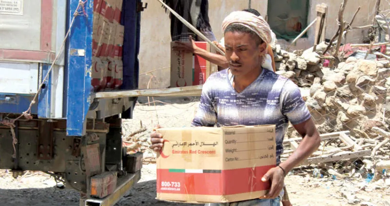 يمني يحمل مساعدات إنسانية وزعها «الهلال الأحمر الإماراتي» في الشريجة التابعة لمحافظة لحج الجنوبية أمس (أ.ف.ب)