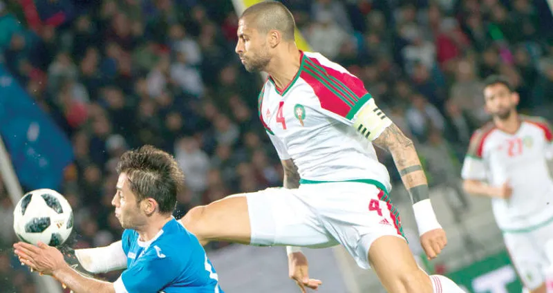 المغربي مروان يقفز للسيطرة على الكرة قبل مدافع أوزبكستان (أ.ف.ب)
