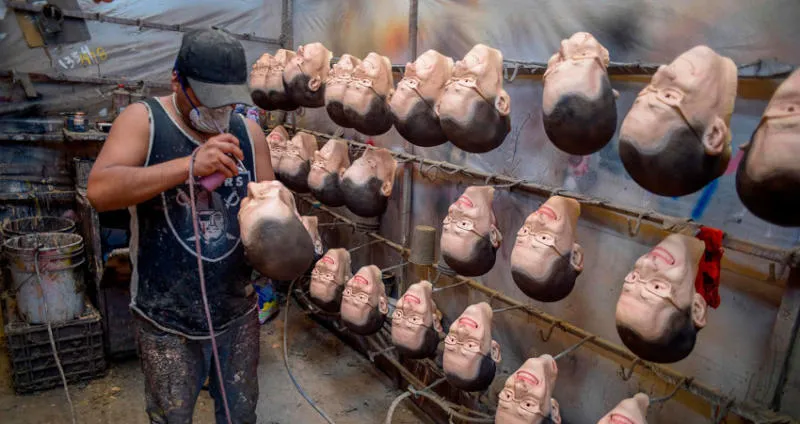 عامل يصنع وجوهاً صناعية لمرشحي الرئاسة المكسيكية مع بدء الحملات الانتخابية (أ.ف.ب)