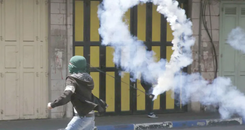 فلسطيني يعيد رمي عبوة مسيلة للدموع في اتجاه الجنود الإسرائيليين في مدينة الخليل أمس (أ.ف.ب)
