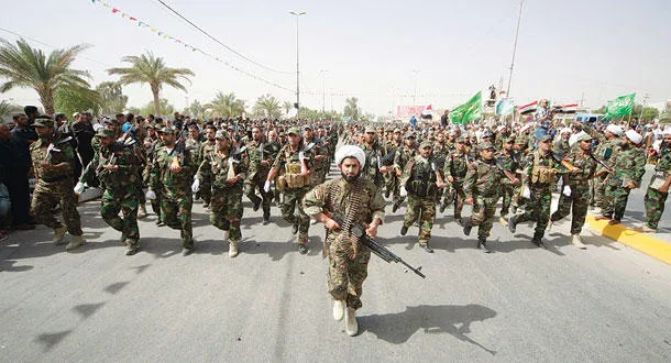 عناصر من جيش المهدي المؤيد لرجل الدين الشيعي مقتدى الصدر في عرض عسكري في مدينة كربلاء أمس (رويترز)