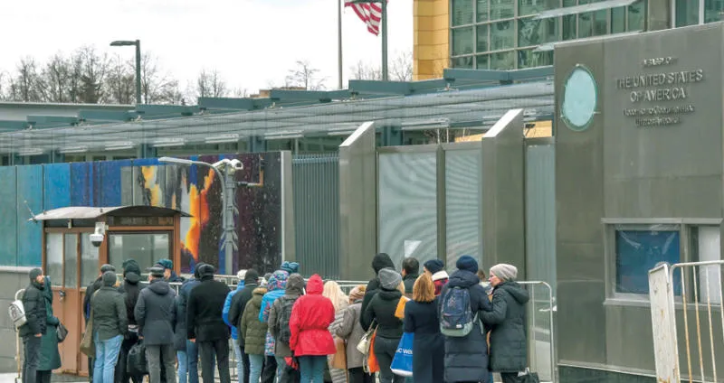 أشخاص ينتظرون تسلم تأشيرات الدخول إلى الولايات المتحدة أمام السفارة الأميركية بموسكو أمس (أ.ف.ب)