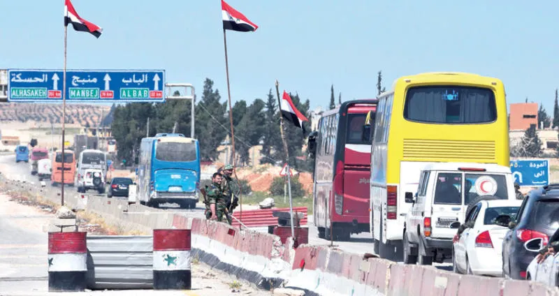 قافلة تقل مقاتلي {جيش الإسلام} وعائلاتهم من دوما باتجاه جرابلس شمال حلب أمس (أ.ف.ب)