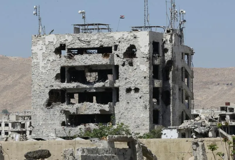 مبنى مدمر في مدينة جوبر بالغوطة الشرقية جراء الحملة العسكرية العنيفة التي شنتها قوات النظام السوري (أ.ف.ب)