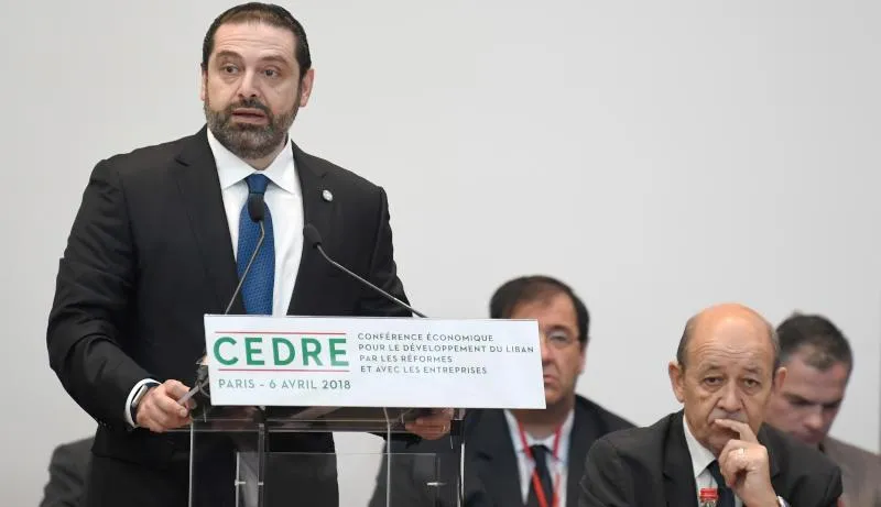 رئيس الوزراء اللبناني سعد الحريري يلقي كلمة بمؤتمر «سيدر» في باريس (إ.ب.أ)