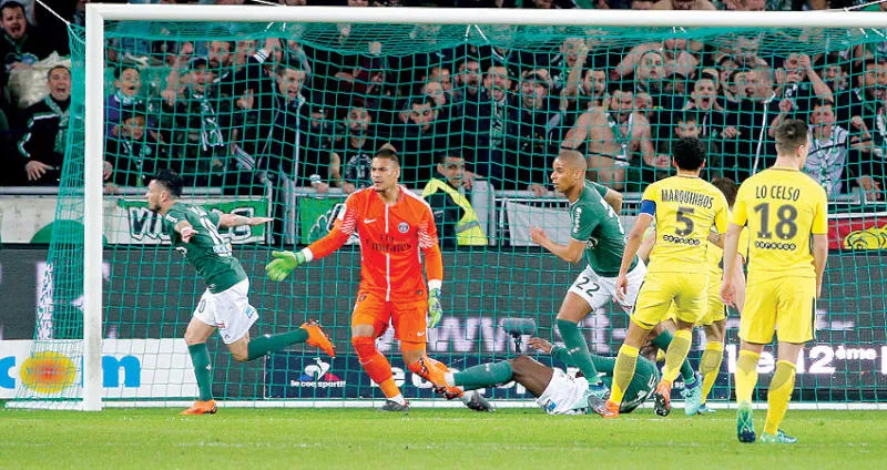 فرّط نادي باريس سان جيرمان بفرصة حسم لقب الدوري الفرنسي لكرة القدم هذا الأسبوع، بتسجيله في الوقت القاتل وبـ«نيران صديقة»، هدف التعادل 1 - 1 في مرمى مضيفه سانت إتيان 1 - 1، في مباراة أنهاها النادي الباريسي بعشرة لاعبين. وكان سان جيرمان أمام فرصة أولى لاستعادة اللقب والتتويج بالدوري المحلي للمرة الخامسة في المواسم الستة الأخيرة، في حال فوزه وخسارة مطارده المباشر وحامل اللقب موناكو أمام ضيفه نانت، ضمن مباريات المرحلة الثانية والثلاثين من الدوري.