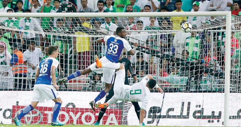 السومة في إحدى الفرص الأهلاوية المهدرة أمام المرمى الهلالي (تصوير: بدر الحمد)
