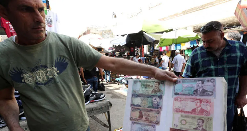 بائع عملة عراقية من عهد الرئيس السابق صدام حسين في سوق الباب الشرقي في بغداد الخميس الماضي (إ.ب.أ)