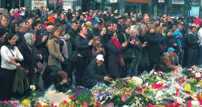 أشخاص من جنسيات مختلفة شاركوا في تأبين ضحايا تفجيرات بروكسل ({الشرق الأوسط})