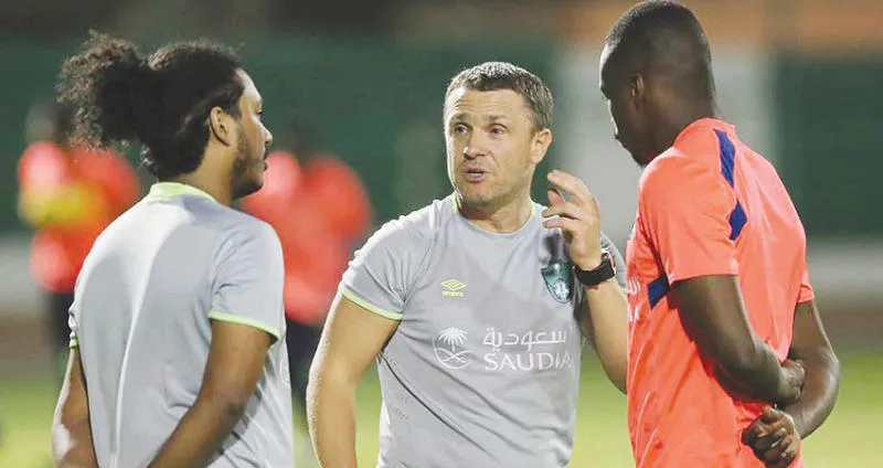 ريبروف مع مساعديه في تدريبات الأهلي الأخيرة («الشرق الأوسط»)