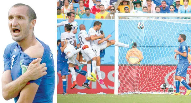 غودين (أقصى اليسار) يسدد برأسه ويحرز هدف الإطاحة بإيطاليا (رويترز) - مدافع إيطاليا كييليني يكشف عن عضة سواريز (رويترز)