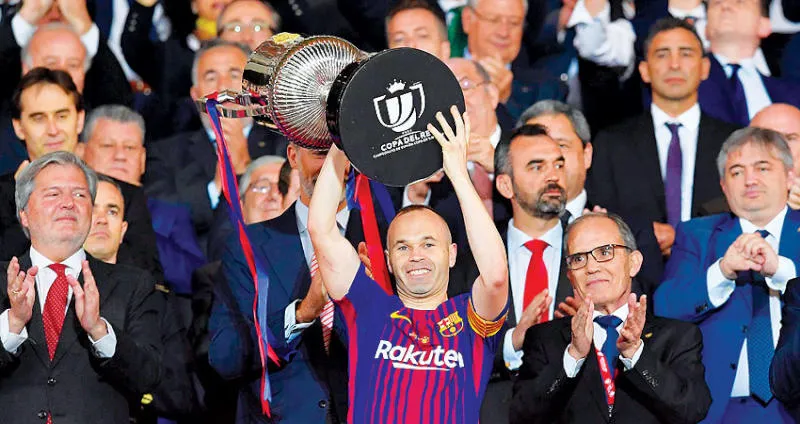 إنيستا قائد برشلونة يحتفل بكأس إسبانيا (أ.ف.ب)
