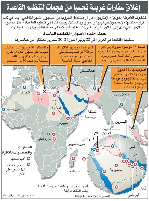 وبحسب المعلومات المتوفرة فإن تزامن تزايد وتيرة المراسلات بين تلك الشخصيات القيادية إلى جانب عمليات تهريب سجناء تنظيم القاعدة في عدة دول بالمنطقة واقتراب موعد انتهاء شهر رمضان دفع البيت الأبيض إلى اتخاذ قرار إغلاق السفارات.