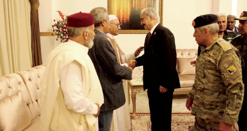 جانب من حفل الاستقبال الذي خصص للمشير حفتر من قبل قادة عسكريين ومحليين في بنغازي أمس (أ.ف.ب)