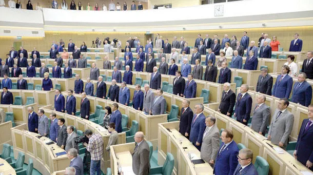 أعضاء مجلس الاتحاد الروسي (الغرفة العليا في البرلمان) يستمعون إلى النشيد الوطني خلال جلسة لهم أمس. وصوت المجلس لصالح إلغاء قرار سابق يسمح للرئيس فلاديمير بوتين باستخدام القوة في أوكرانيا (أ.ف.ب)