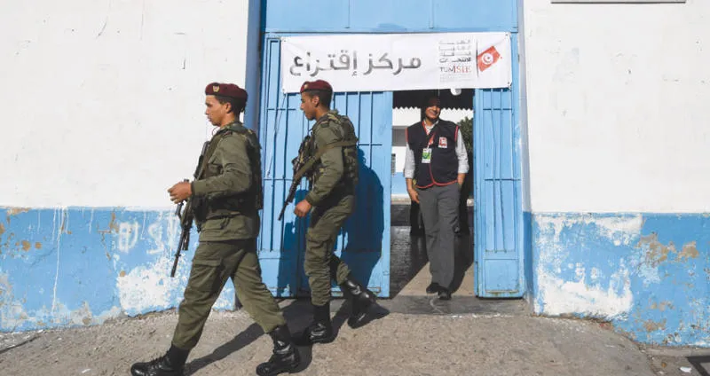 جنديان يحرسان مركز اقتراع في العاصمة التونسية أمس (أ.ف.ب)