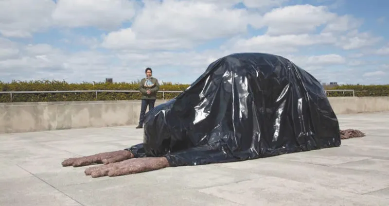 وأمامه، يوجد عمل آخر ممدد على الأرض بشكل قاربي مغطى بالقماش طوله خمسة أمتار لا يظهر منه من أسفل الغطاء القماشي سوى يدان ممدودتان إلى الأمام وذيل ممتد إلى الخلف على الأرض، حسب وكالة الأنباء الألمانية.