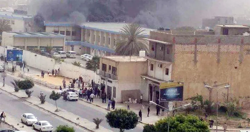 دخان يتصاعد من مقر المفوضية العليا للانتخابات الليبية في طرابلس بعد الهجوم (تويتر)
