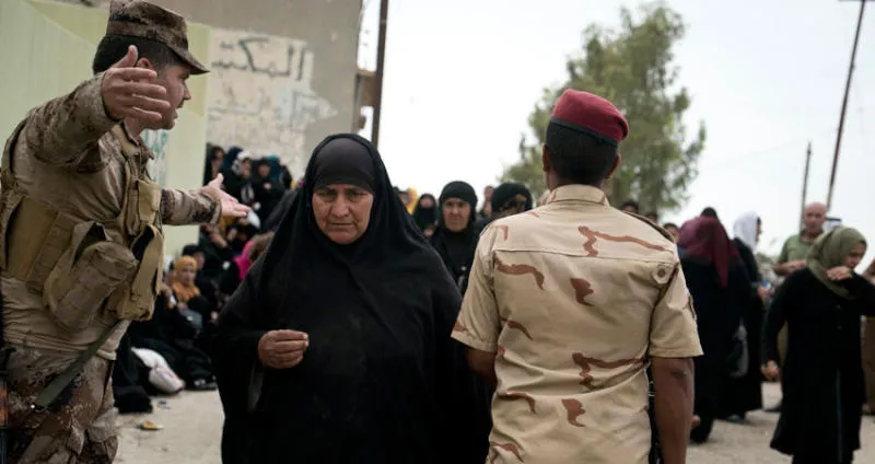 نسوة أمام مقر محكمة تنظر في ملفات متهمين بالانتماء إلى «داعش» في تلكيف بمحافظة نينوى شمال العراق الشهر الماضي (أ.ب)