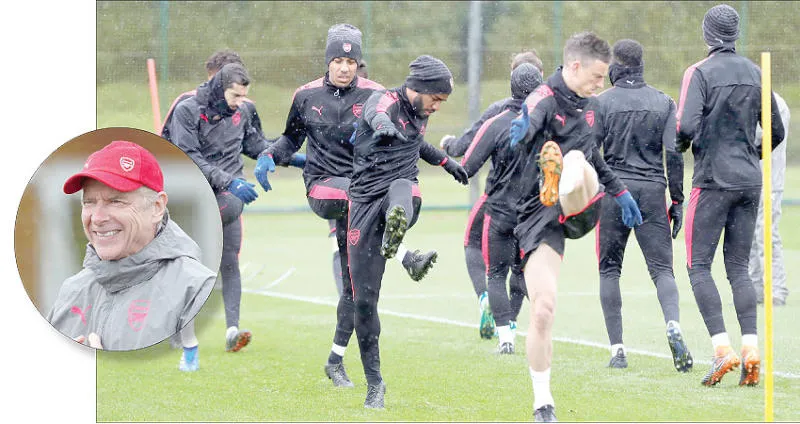 لاعبو آرسنال خلال التدريبات أمس قبل المباراة المصيرية مع أتليتكو (رويترز) - فينغر يأمل في قيادة آرسنال للقب قبل الرحيل (أ.ف.ب)