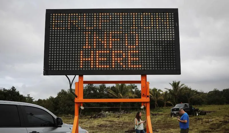 علامة مكتوب عليها «معلومات الانفجار هنا» بالقرب من جزيرة هاواي (أ.ف.ب)