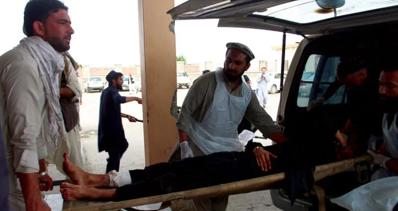 نقل الجرحى ضحايا التفجير الانتحاري في مركز انتخابي بخوست شرق أفغانستان أمس (أ.ف.ب)