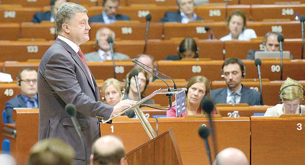 بوروشينكو أثناء إلقاء كلمته أمام الجمعية البرلمانية لمجلس أوروبا في ستراسبورغ أمس (أ.ف.ب)