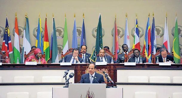 وعبر السيسي عن تقديره للحضور البارز للاتحاد الأفريقي من خلال بعثة متابعة الانتخابات الرئاسية التابعة له. وتعهد بأن تواصل مصر بذل أقصى الجهد بالتعاون مع الأشقاء الأفارقة للعمل على تسوية النزاعات، ودعم كل مجالات التنمية بما فيها إعادة الإعمار في المناطق الأفريقية المتضررة من النزاعات، معلنا إنشاء «الوكالة المصرية للشراكة من أجل التنمية في أفريقيا»، والتي ستبدأ عملها أول يوليو المقبل لإعداد وتأهيل الأطر الأفريقية ودعم مبادرات جديدة لتنفيذ مشروعات تنموية رائدة في القارة. ولفت الرئيس المصري إلى حجم التحديات الجسيمة التي تواجهها القارة الأفريقية في مجال السلم والأمن، مؤكدا أن «الأمر يملي على الجميع تكثيف الجهود وحشد الإمكانيات الذاتية لتفعيل مبدأ الحلول الأفريقية للمشاكل الأفريقية». كما أكد أن مصر ستواصل جهودها لبناء القدرات الأفريقية في مجالات الدبلوماسية الوقائية ومنع وإدارة وتسوية النزاعات وإعادة الإعمار والتنمية بما يحول دون انزلاق الدول الخارجة من النزاعات إليها مجددا، وتطوير الآليات الملائمة للتعامل مع كل هذه المسائل، فضلا عن تعزيز مساهمة مصر في بعثات حفظ وبناء السلام في مختلف ربوع القارة، مدينا كل أشكال الإرهاب في القاهرة، قائلا «لا مجال لتبريره أو التسامح معه بعد أن أصبح أداة لتمزيق الدول وتدمير الشعوب وتشويه الدين».