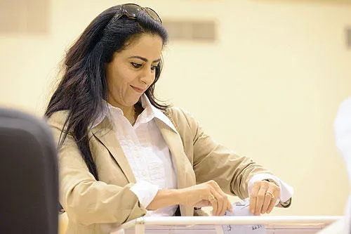 كويتية تدلي بصوتها خلال عملية اختيار النواب المكملين لعضوية مجلس الأمة أول من أمس