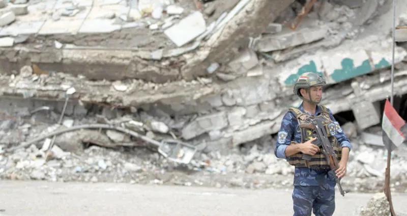 جندي في إحدى نقاط الحراسة في مدينة الموصل المدمرة التي تستعد للاقتراع اليوم (أ.ف.ب)