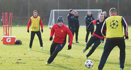 روني نجم مانشستر يونايتد (في الوسط) عاد لتدريبات فريقه أمس استعدادا لمواجهة شاختار بعد أن غاب عن لقاء نيوكاسل المحلي (أ.ب)