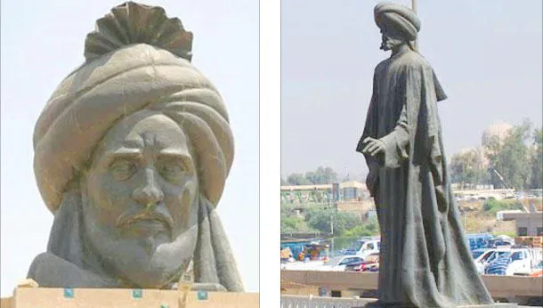 تمثال أبي تمام في الموصل قبل هدمه (يمين) و تمثال أبي جعفر المنصور في بغداد