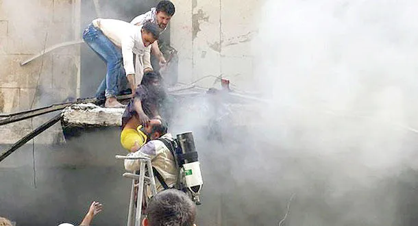 سوريون يحاولون انقاذ طفلة إثر غارة لطيران النظام على منطقة كرم الجبل في حلب أمس (أ.ب)
