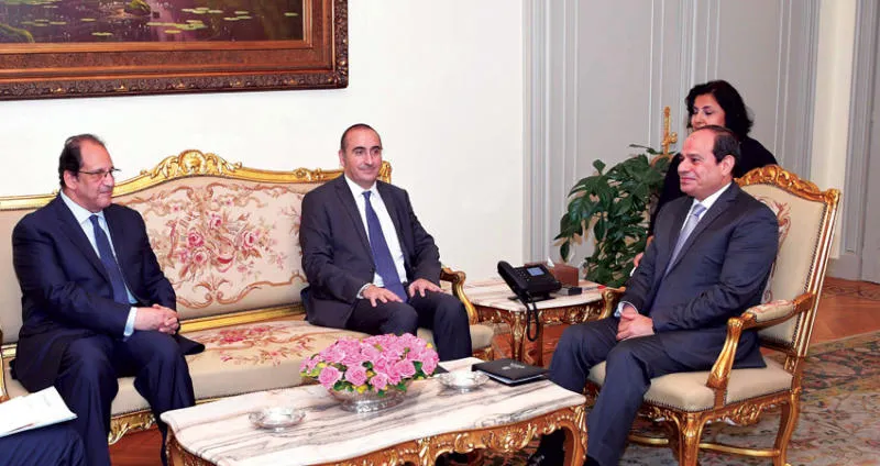 الرئيس المصري عبد الفتاح السيسي يستقبل رئيس جهاز الاستخبارات الداخلية الفرنسي لوران نونيز في القاهرة أمس (صورة من الرئاسة المصرية)