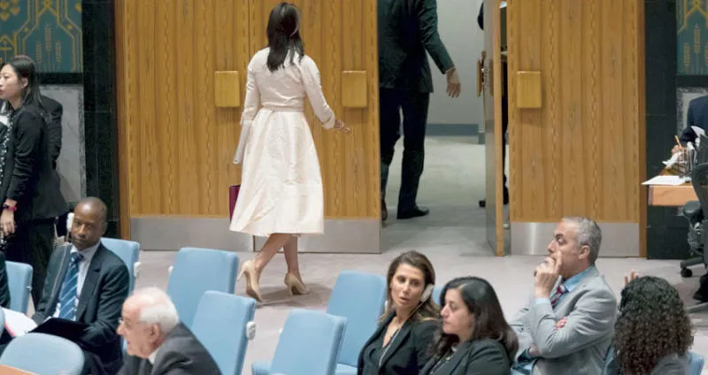سفيرة الولايات المتحدة نيكي هيلي تغادر قاعة مجلس الأمن مع بدء مندوب فلسطين رياض منصور إلقاء كلمته أمس (أ.ب)