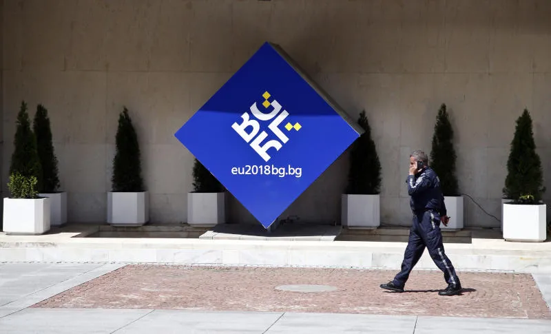 ضابط أمن يمر أمام شعار رئاسة بلغاريا للاتحاد الأوروبي قبل قمة تعقد اليوم الأربعاء في صوفيا (أ.ب)