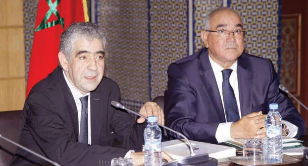 الشرقي أضريس الوزير في وزارة الداخلية المغربية وإدريس اليزمي رئيس مجلس حقوق الإنسان خلال تنصيب اللجنة المكلفة تتبع ملفات تسوية أوضاع المهاجرين، مساء أول من أمس في الرباط (تصوير: مصطفى حبيس)