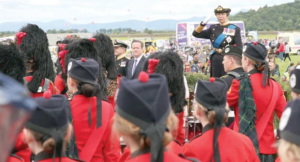 الأميرة آن ابنة ملكة بريطانيا توجه تحية بينما يبدو رئيس الوزراء ديفيد كاميرون (وسط خلف) ضمن الحضور خلال عرض عسكري بمناسبة «يوم القوات المسلحة» في مدينة ستيرلينغ باسكوتلندا أمس (إ.ب.أ)