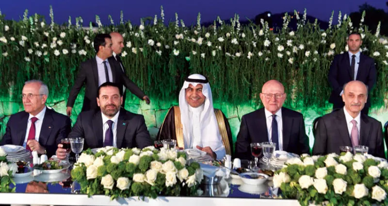 جانب من إفطار السفارة السعودية في بيروت ويبدو سعد الحريري وميشال سليمان وتمام سلام وسمير جعجع يتوسطهم المستشار في الديوان الملكي السعودي نزار العلولا («الشرق الأوسط»)