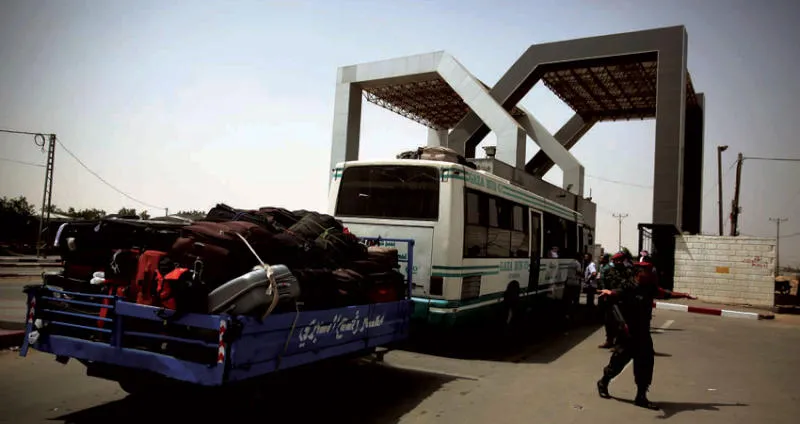 حافلة ركاب في طريقها لاجتياز معبر رفح باتجاه الأراضي المصرية بعد فتح المعبر (أ.ب)