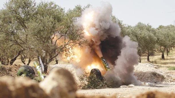 صاروخ لحظة إطلاقه من قبل الجيش السوري الحر باتجاه القوات الحكومية في الحميدية جنوب إدلب (رويترز)
