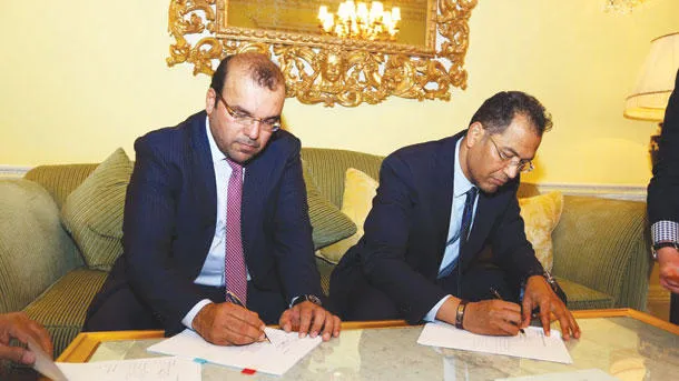 خالد الكاف الرئيس التنفيذي لشركة «موبايلي» لحظة توقيع العقود مع أحد ممثلي الشركة («الشرق الأوسط»)