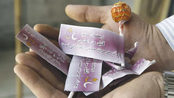 فلسطيني يعرض حلوى وزعتها السلطات الإسرائيلية، أمس، في مخيم بلاطة بالضفة الغربية، كُتبت عليها عبارات تندد بحماس (أ.ف.ب)