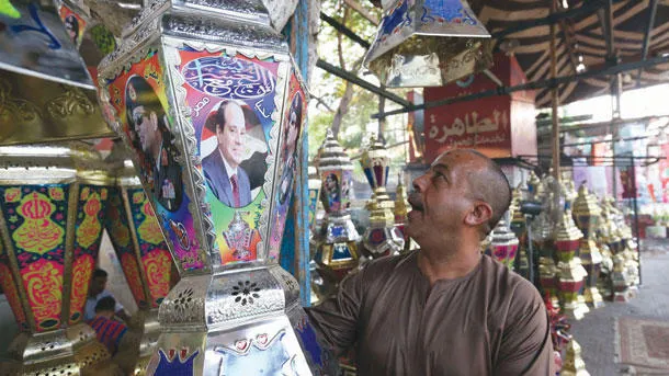 صورة الرئيس عبد الفتاح السيسي تزين واجهة فوانيس رمضان بأحد الأسواق القديمة في القاهرة أمس (رويترز)