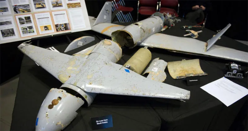 طائرة قاصف 1 الإيرانية التي يستخدمها الحوثيين، معروضة في أميركا العام الماضي.