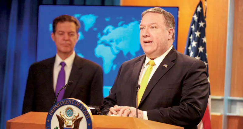 بومبيو يتحدث عن تقرير الحريات الدينية بحضور السفير براونباك في وزارة الخارجية أمس (رويترز)