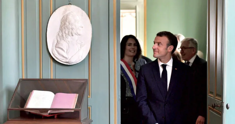 الرئيس الفرنسي خلال زيارة إلى قصر المفكر الشهير فولتير في مدينة فيرني قرب جنيف (أ.ف.ب)