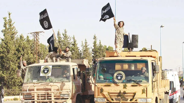 جانب من الاستعراض العسكري الذي نظمه تنظيم «داعش» في الرقة للاحتفال بإعلان «الخلافة الإسلامية» أمس (رويترز)